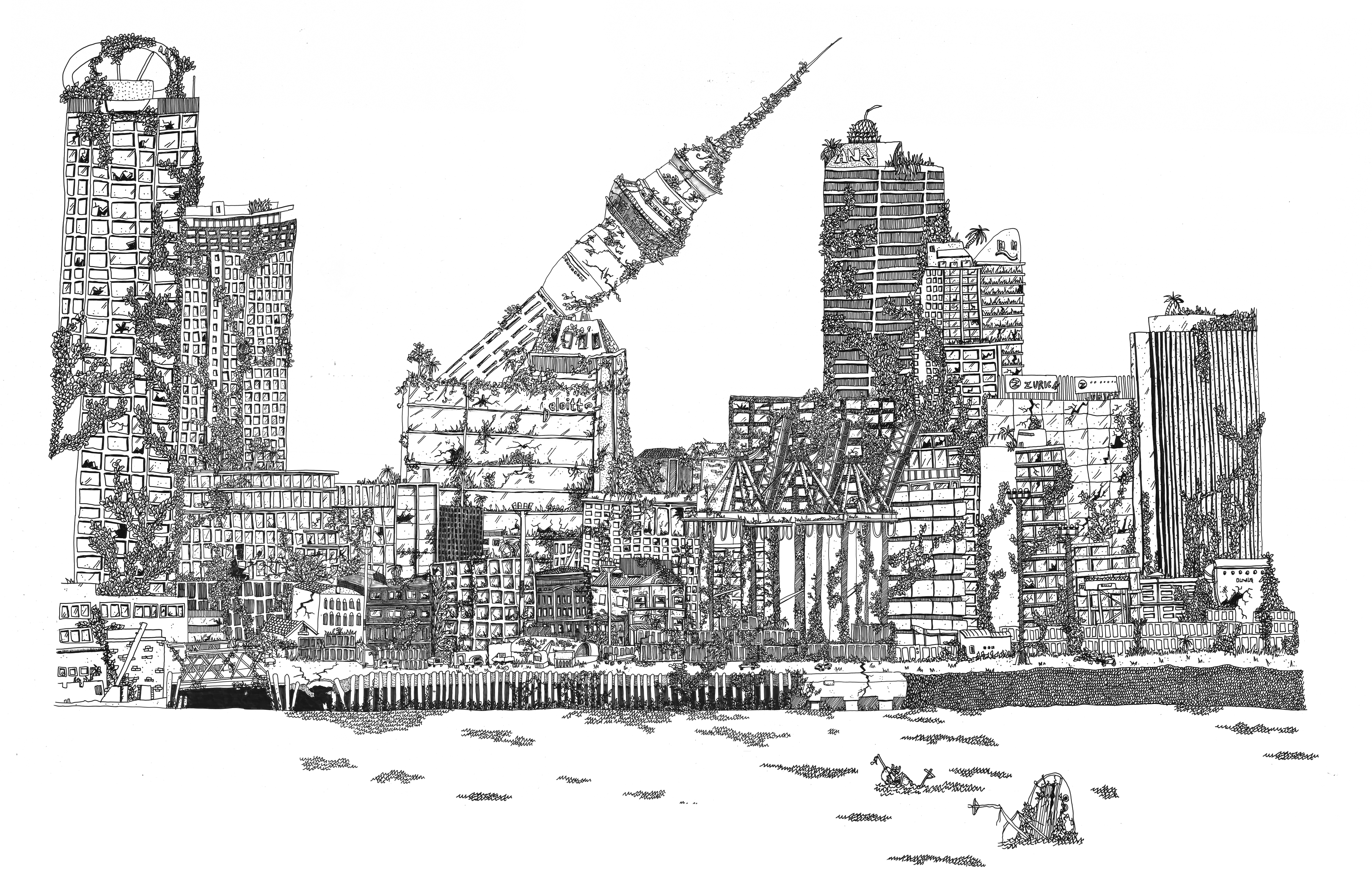 We discovered illustrator Nicola Brady at Auckland’s Chromacon Festival of Illustration, and hired her to provide a unique image of postapocalyptic Auckland, with a fallen Skytower, to create a dramatic scenario and remind library users that heritage can be dynamic and critical as well as conservative.
