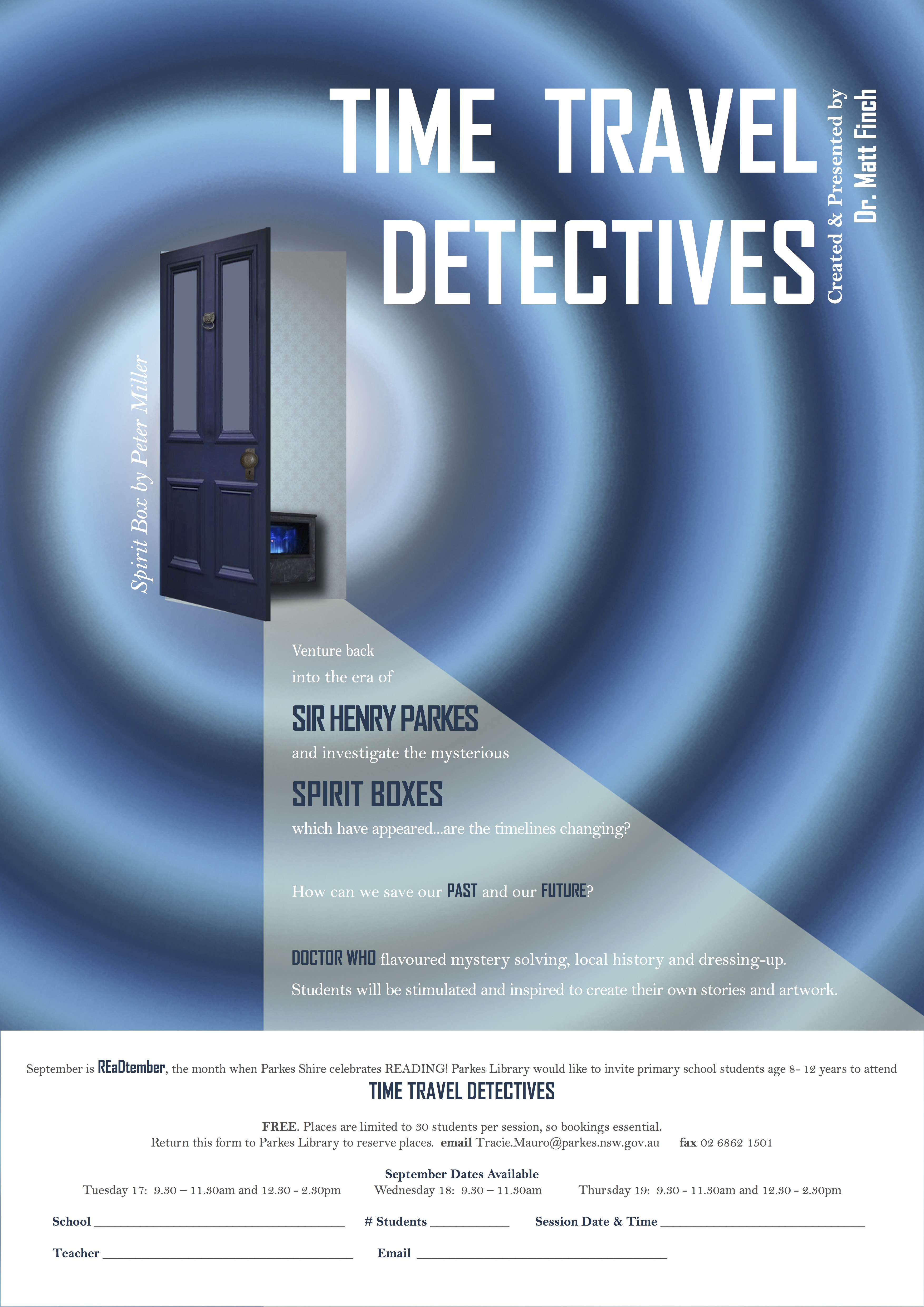 This article looks at Time Travel Detectives, my recent youth activity for Parkes Library in New South Wales. For more on the concept of storylining a public library system’s youth offerings, see TimeQuest – A Scientific Romance for Libraries.